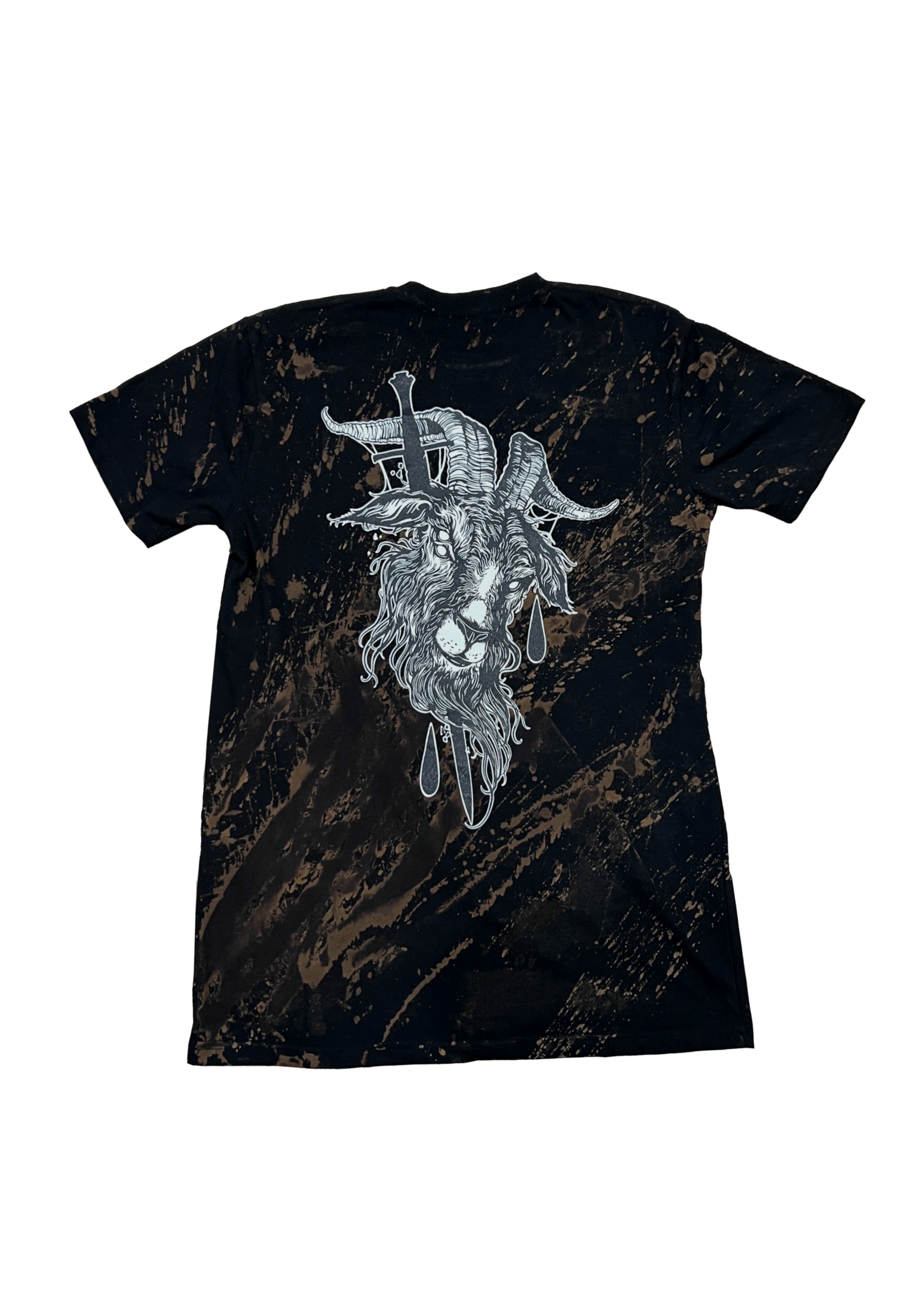 Our bleach dyed Goat Tee upholds a dark aesthetic with the Decayed script printed on the front, and sword punctured goat head on the back. The bleach gives a dirty brown/auburn splatter effect.